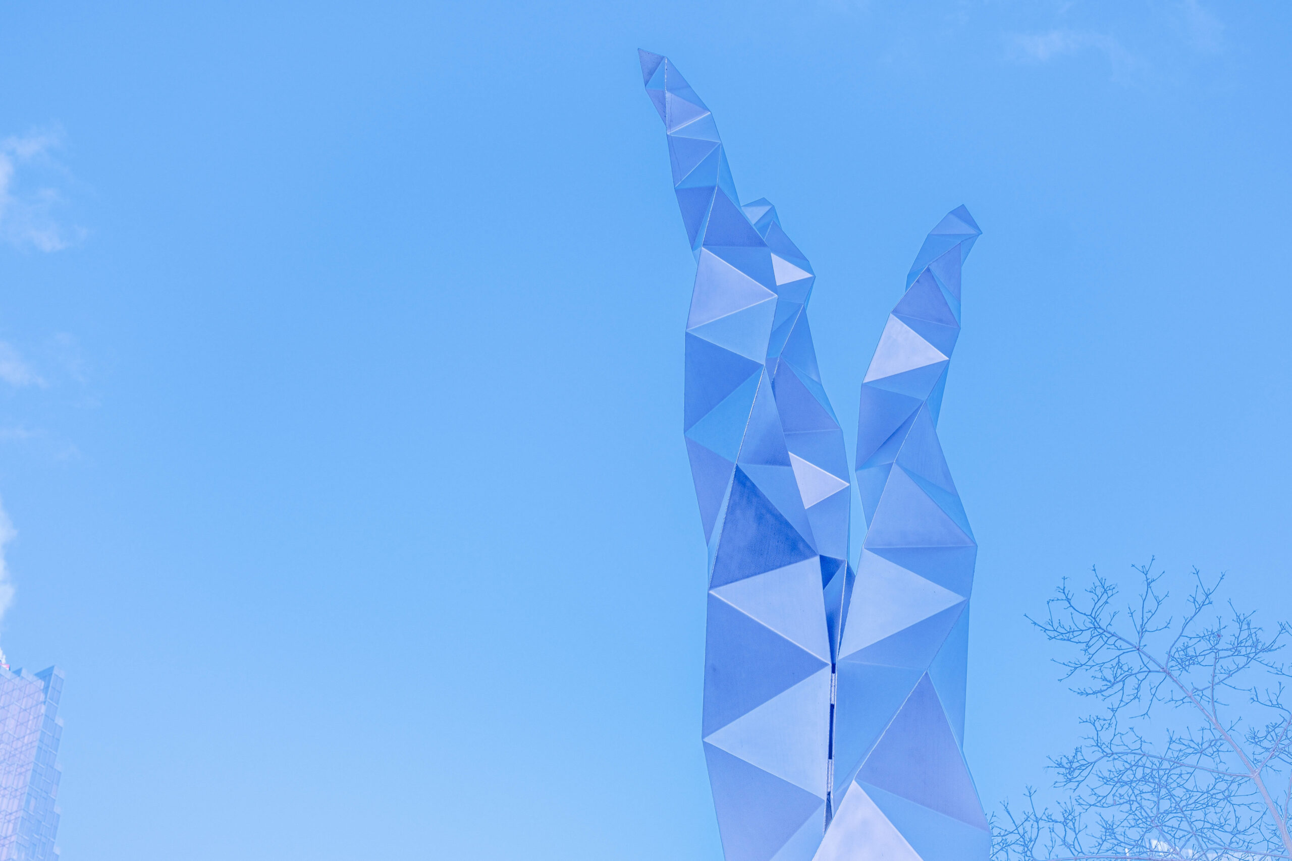 Continuous glazing transforms surroundings into texture and movement. From street level, disciplined mullion grids emphasize verticality while subtle façade curves soften rigid geometry. Nearby, a faceted sculpture fragments reflections into angular planes, contrasting the smooth continuity of the towers.