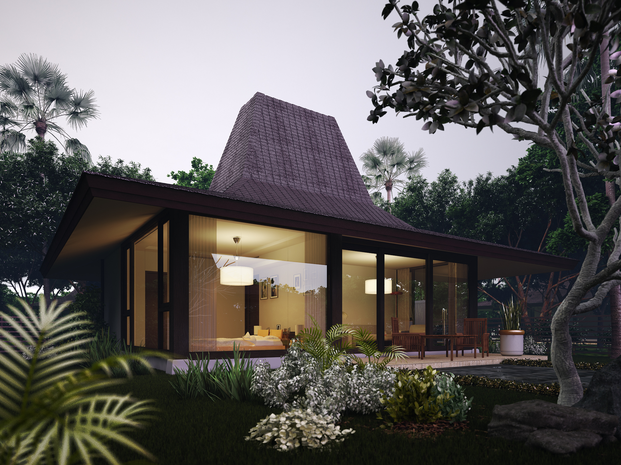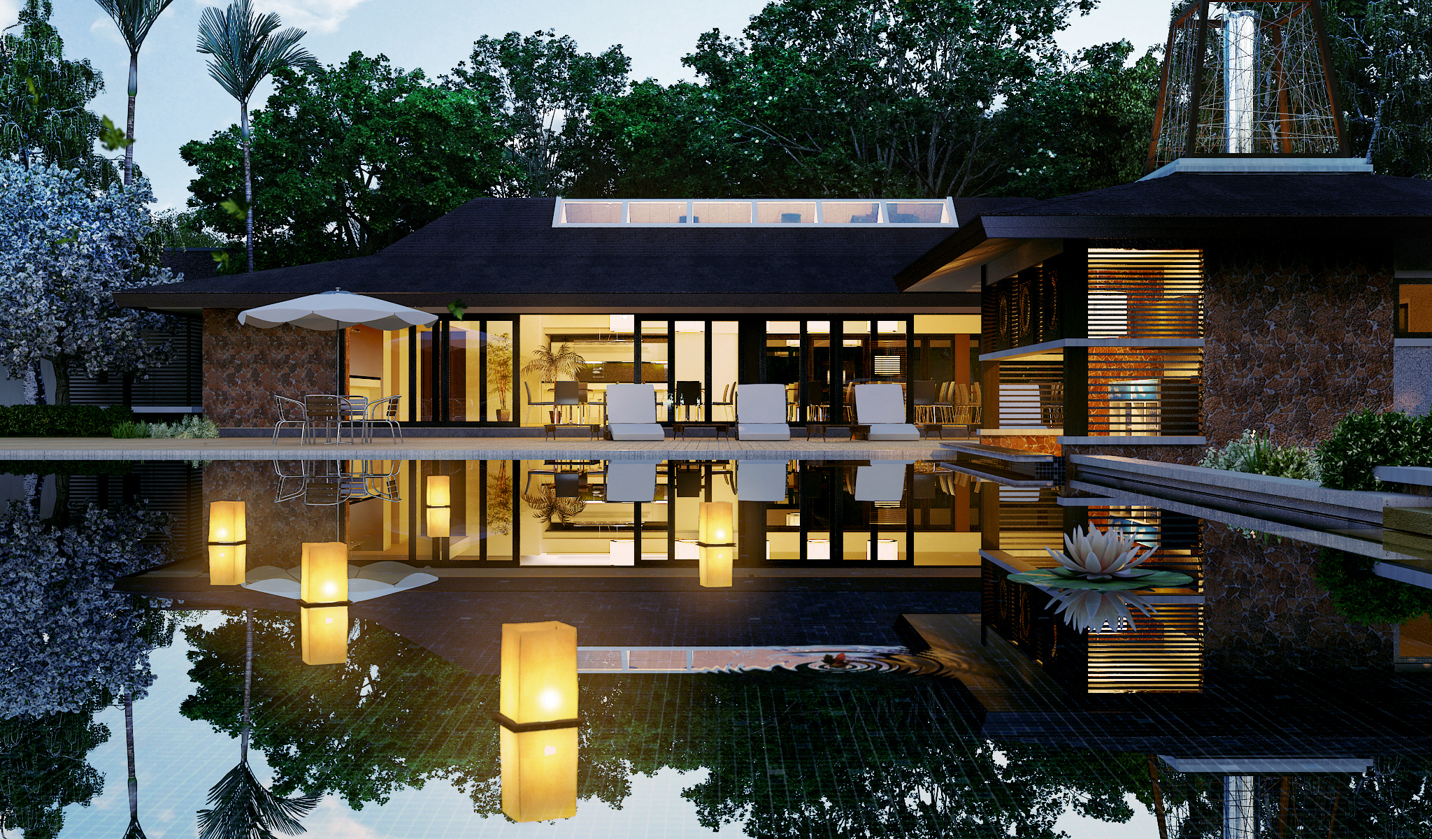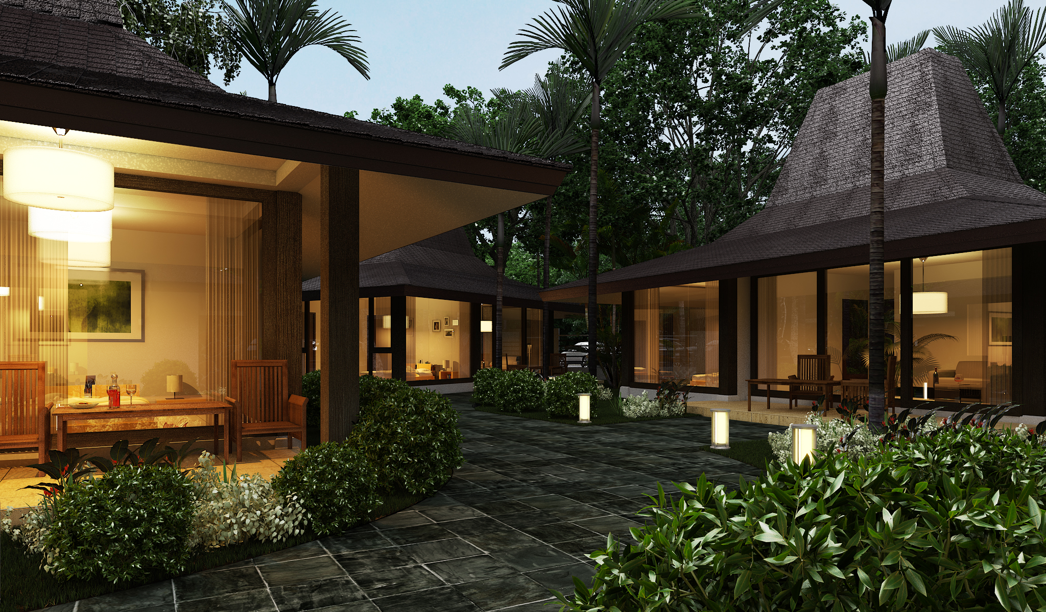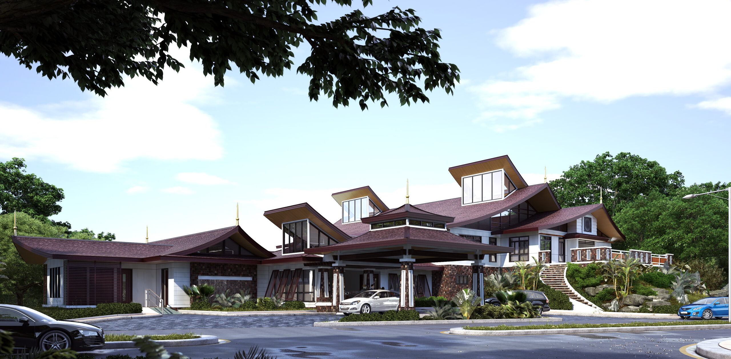 Material selections reinforce the tropical character of the project. Warm timber finishes, natural stone textures, and neutral-toned plastered surfaces complement the lush surroundings, while the layered roof forms provide both architectural identity and passive shading. The clubhouse’s design balances elegance with comfort, ensuring that communal spaces remain welcoming while maintaining a refined residential aesthetic.