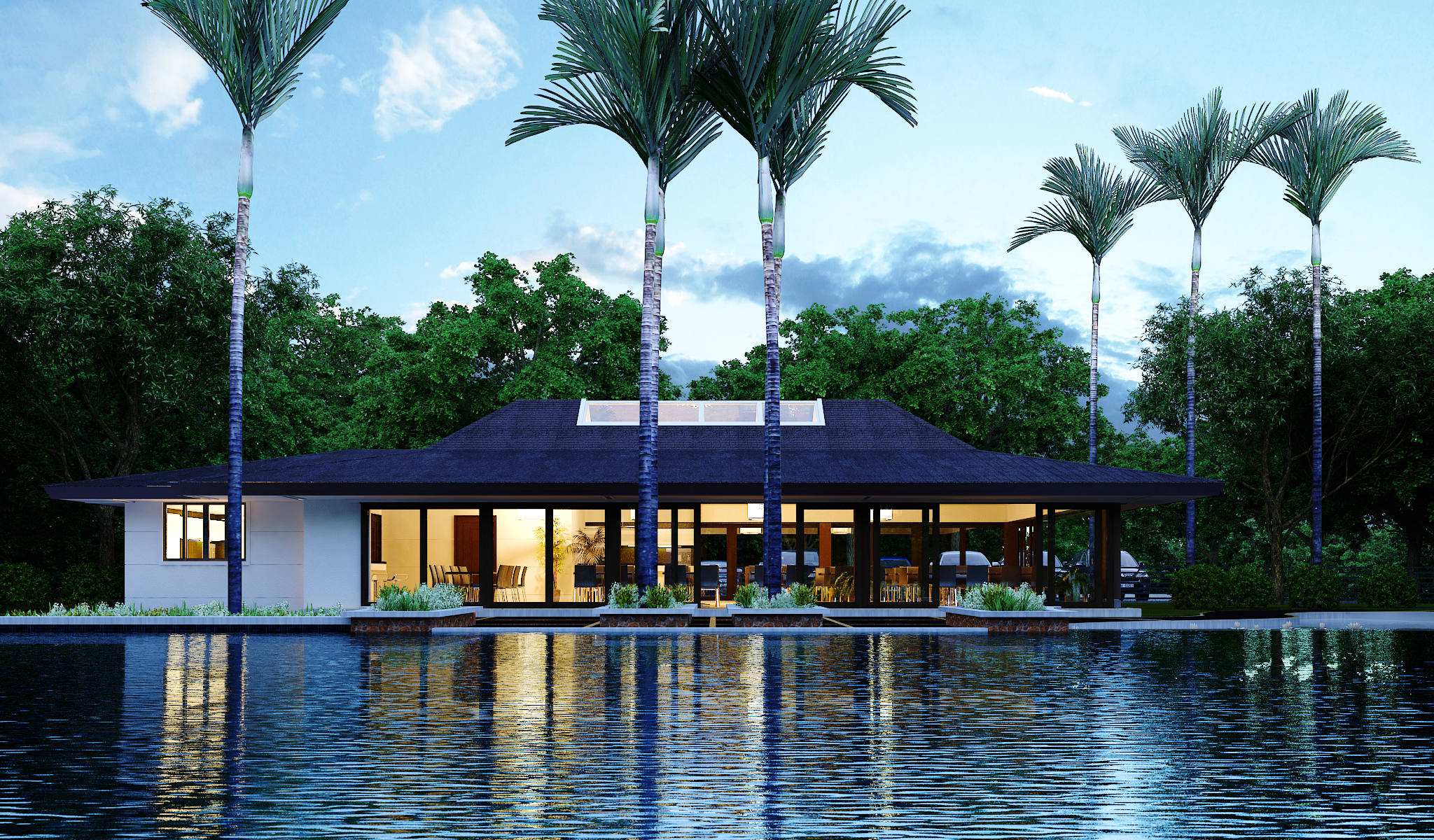 The architectural composition emphasizes relaxation and leisure through its relationship with water and greenery. Expansive pools, landscaped gardens, and palm-lined walkways frame the clubhouse, reinforcing the atmosphere of a private resort within the residential community. Large glass openings allow interior spaces to visually extend toward outdoor terraces and pool areas, creating fluid transitions between indoor amenities and outdoor recreational zones.
