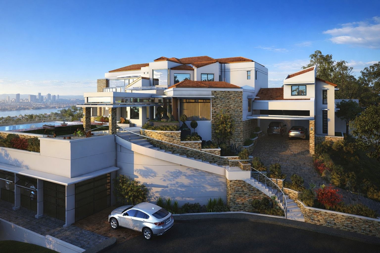• Modern residential composition with layered terraces