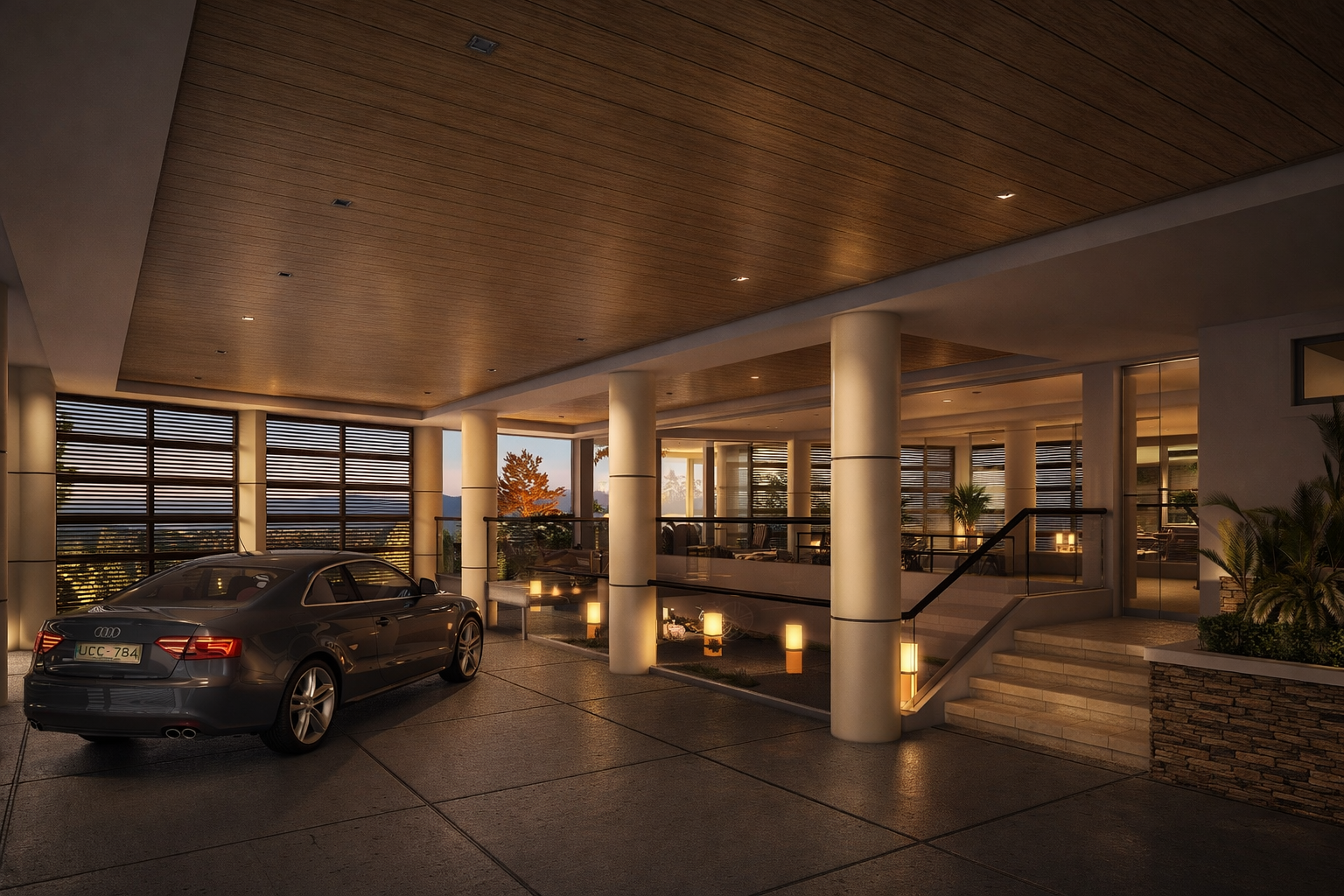 The exterior architecture is defined by a composition of clean white volumes, natural stone cladding, warm wood accents, and expansive glazing. These elements establish a balance between modern geometry and natural textures, giving the residence a strong visual presence while maintaining a refined residential character. Lighting conditions and material reflections were carefully considered to portray the atmosphere of the hillside setting.