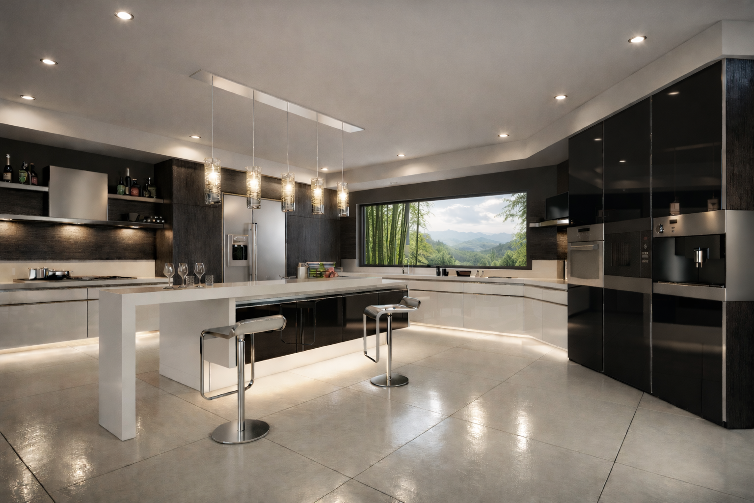Interior perspectives communicate spatial clarity, material richness, and ambient lighting. Key spaces such as the kitchen and living areas highlight contemporary finishes, controlled illumination, and reflective surfaces that enhance depth and realism. The visualizations capture both the functional organization of the interior and the intended mood of the living spaces.