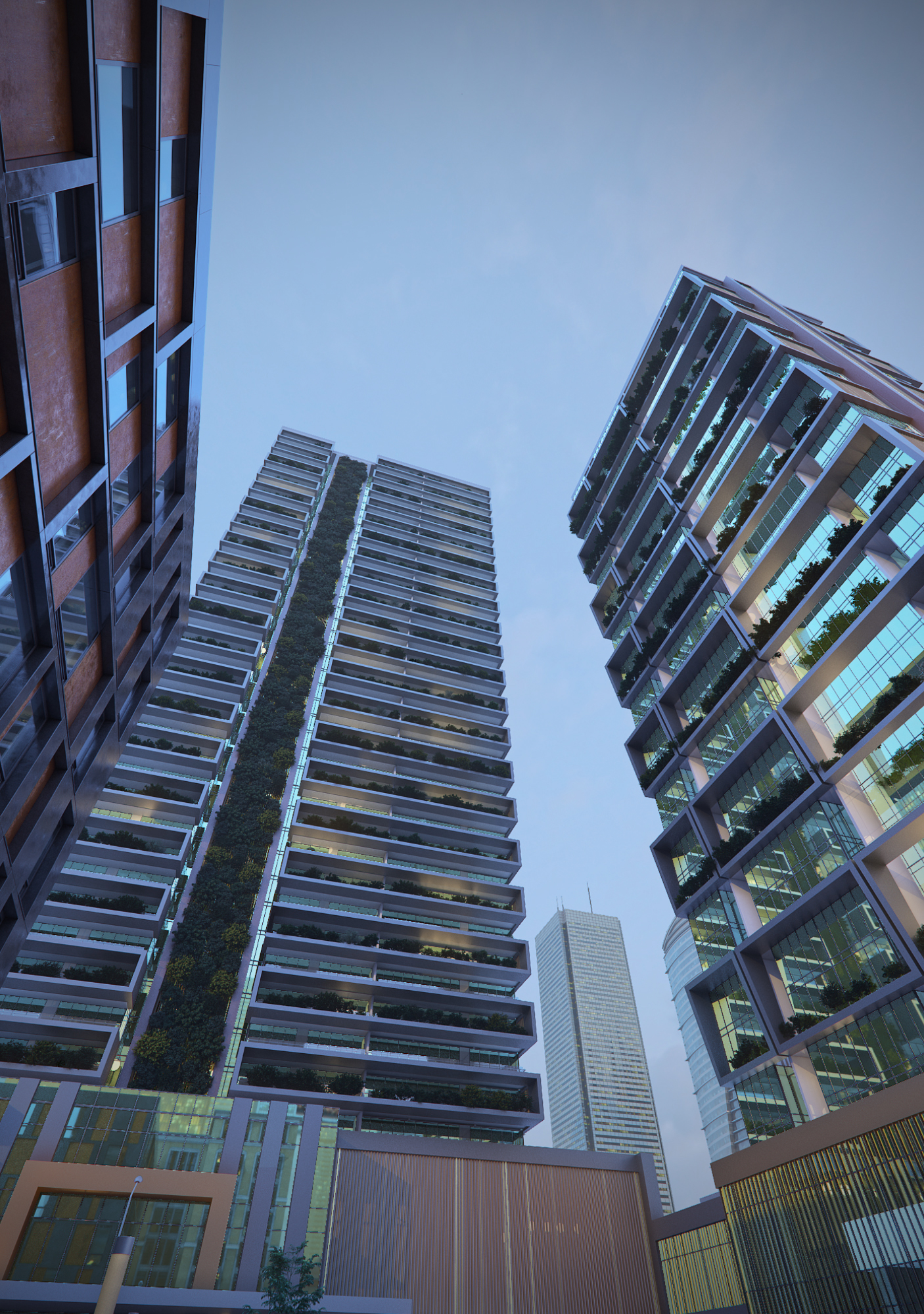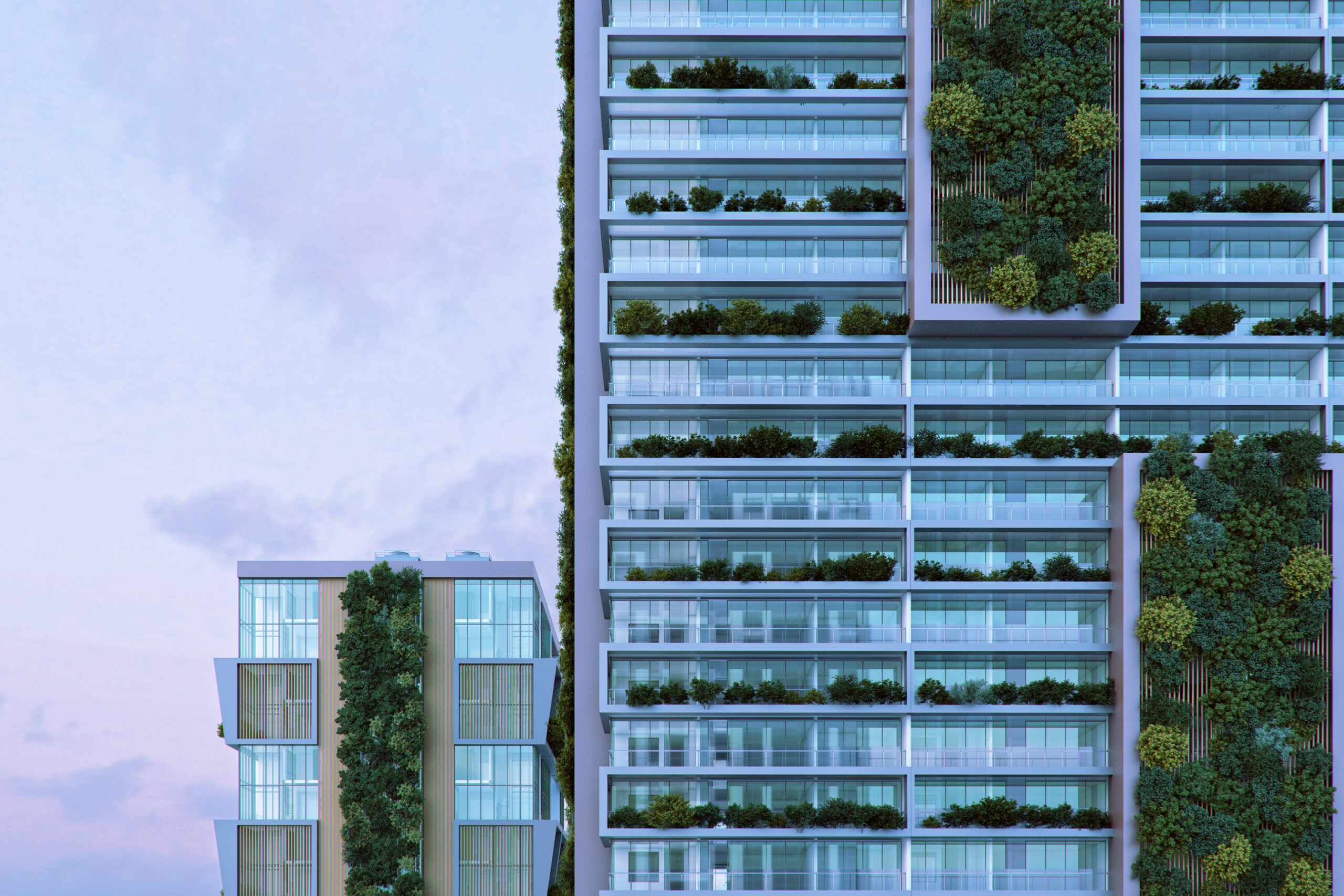 The architectural concept emphasizes vertical living environments enhanced by integrated vegetation. The towers incorporate vertical garden systems along the building façade, introducing greenery into the urban skyline while contributing to environmental performance and visual identity. Terraced balconies, glass curtain wall systems, and strong vertical structural expression define the architectural language of the development.
